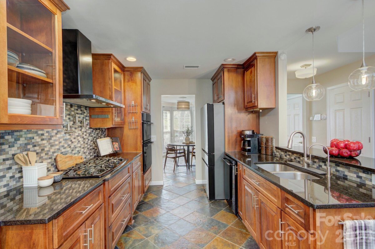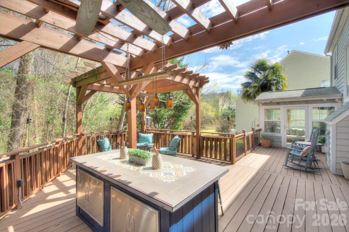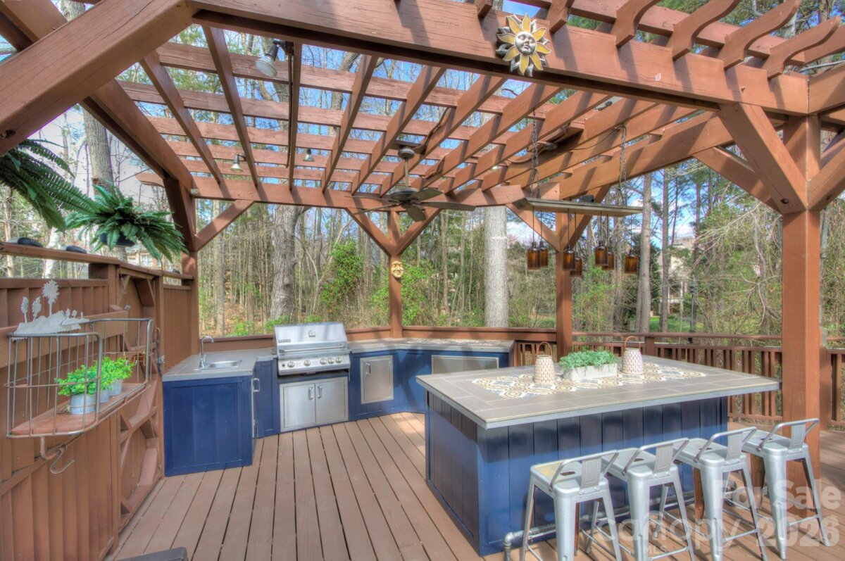 Welcome to this beautifully updated home where outdoor living becomes a natural extension of everyday life. The expansive 600 sq ft deck creates the perfect setting for entertaining or relaxing evenings at home, complete with an outdoor kitchen, dedicated entertaining space, and pergola. Natural gas direct line JennAir grill and hand sink. The lot offers exceptional privacy with mature trees and adjacent HOA green space, creating a peaceful backdrop rarely found in such a convenient location. Inside, the updated kitchen features abundant cabinet and counter space—truly a chef’s delight and ideal for both everyday cooking and hosting gatherings. The spacious primary suite offers a private retreat with an en-suite bathroom featuring dual vanities, a soaking tub, and separate shower. The walk-in closet with custom organizer provides excellent storage and functionality. With fresh paint in many areas and brand-new carpet, this home is truly move-in ready and waiting for its next owners to begin making memories. Located in sought-after Edinburgh, the home is just minutes from Ballantyne, I-485, and Indian Land. Enjoy a quick ride to The Bowl at Ballantyne for dinner, drinks, or live entertainment.