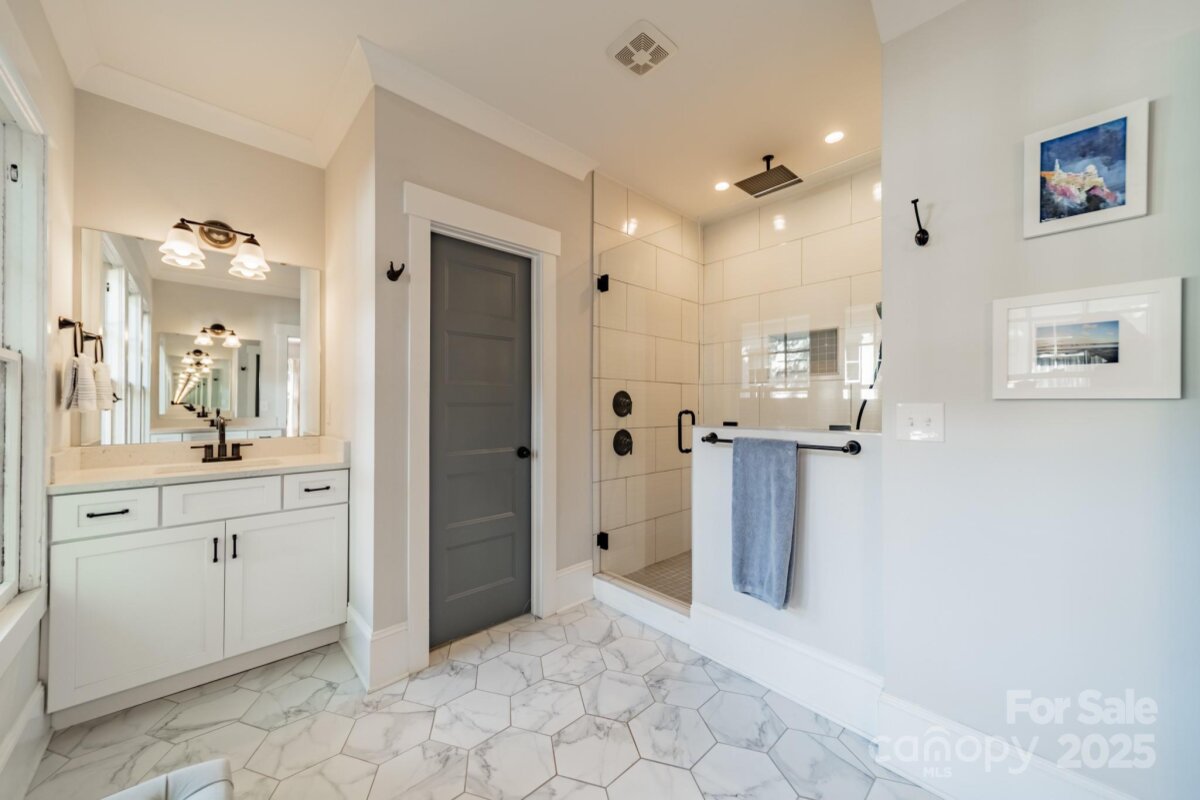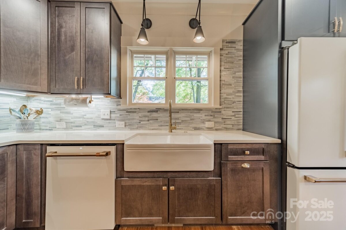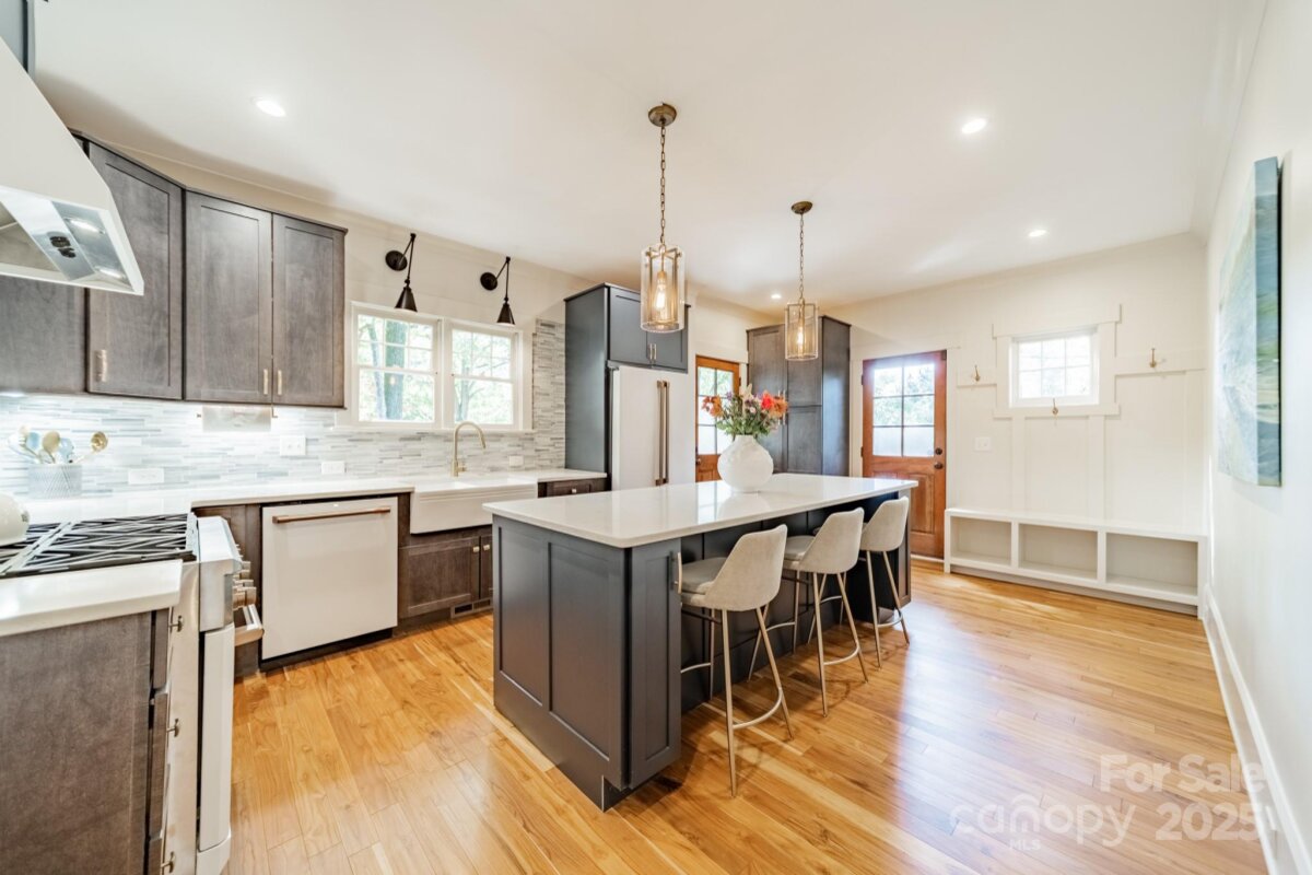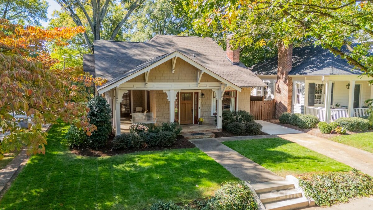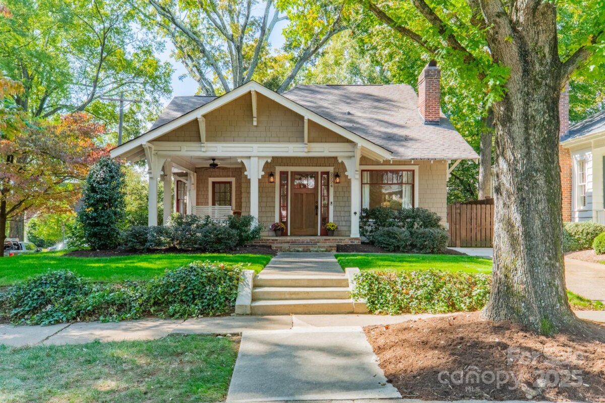 Completely renovated from top to bottom, this classic 1922 Dilworth bungalow sits on coveted Sarah Marks Avenue—one of the most sought-after and picturesque streets in Charlotte. Located in Dilworth's Historic District and offering just over 2,000 square feet, this three-bedroom, two-and-a-half-bath home blends timeless character with designer-level sophistication. The spacious main-level owner’s suite is a rare find in historic Dilworth, featuring a spa-inspired bath with dual vanities and custom finishes. The reimagined kitchen showcases a large center island, new cabinetry, quartz countertops, upgraded stainless-steel appliances, and curated lighting and wallpaper details that elevate every corner. A wide wraparound porch welcomes relaxed living and entertaining, while the fenced backyard with low-maintenance turf offers privacy and charm. The detached storage shed—a unique bonus, provides excellent storage space for bikes, tools, or seasonal items. With beautiful teak flooring, fully updated baths, thoughtful landscaping, and no HOA, this home perfectly captures the walkable Dilworth lifestyle—just steps from East Boulevard’s boutiques, coffee spots, and parks. Welcome Home!
