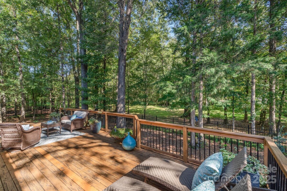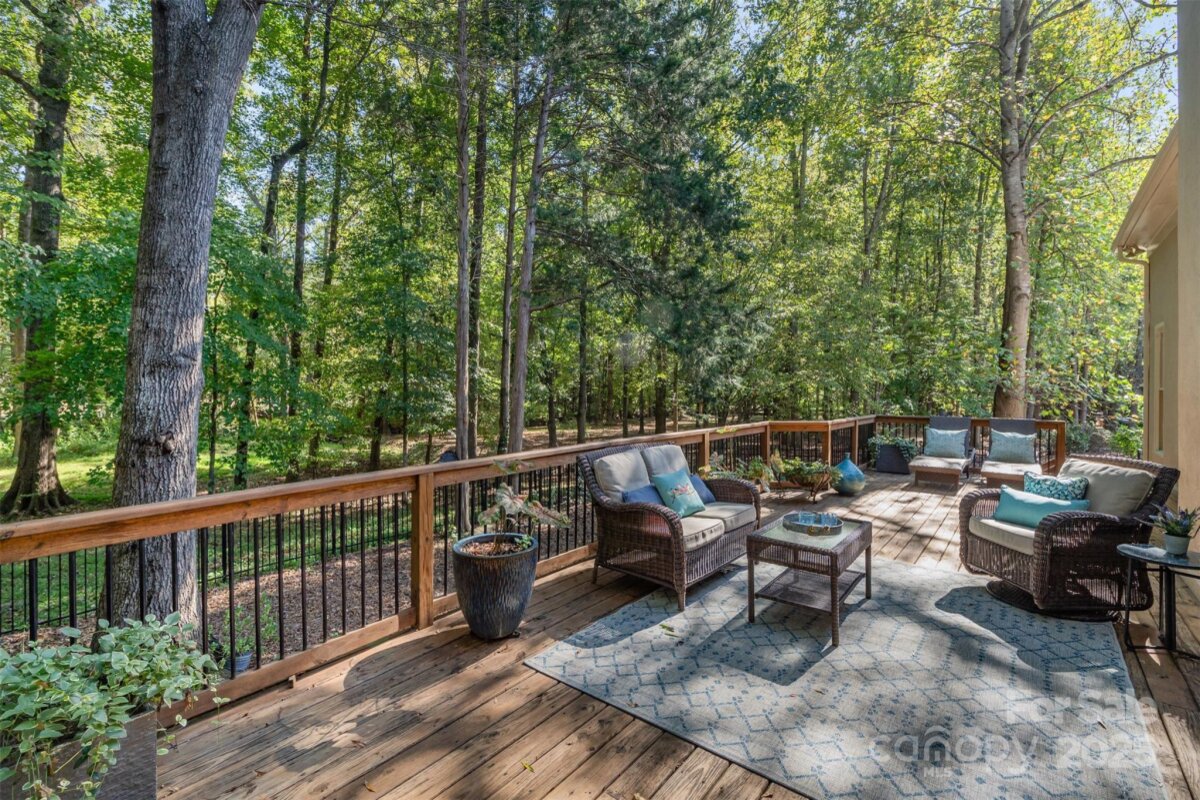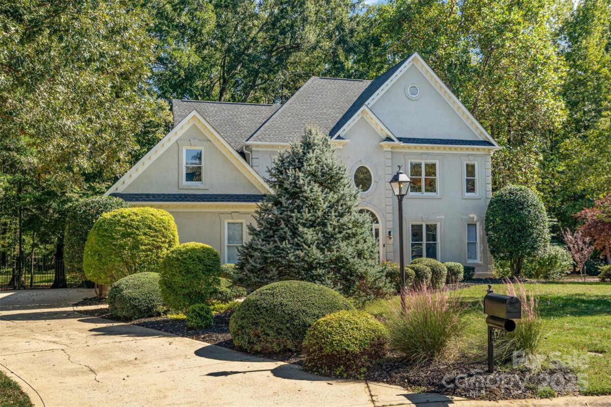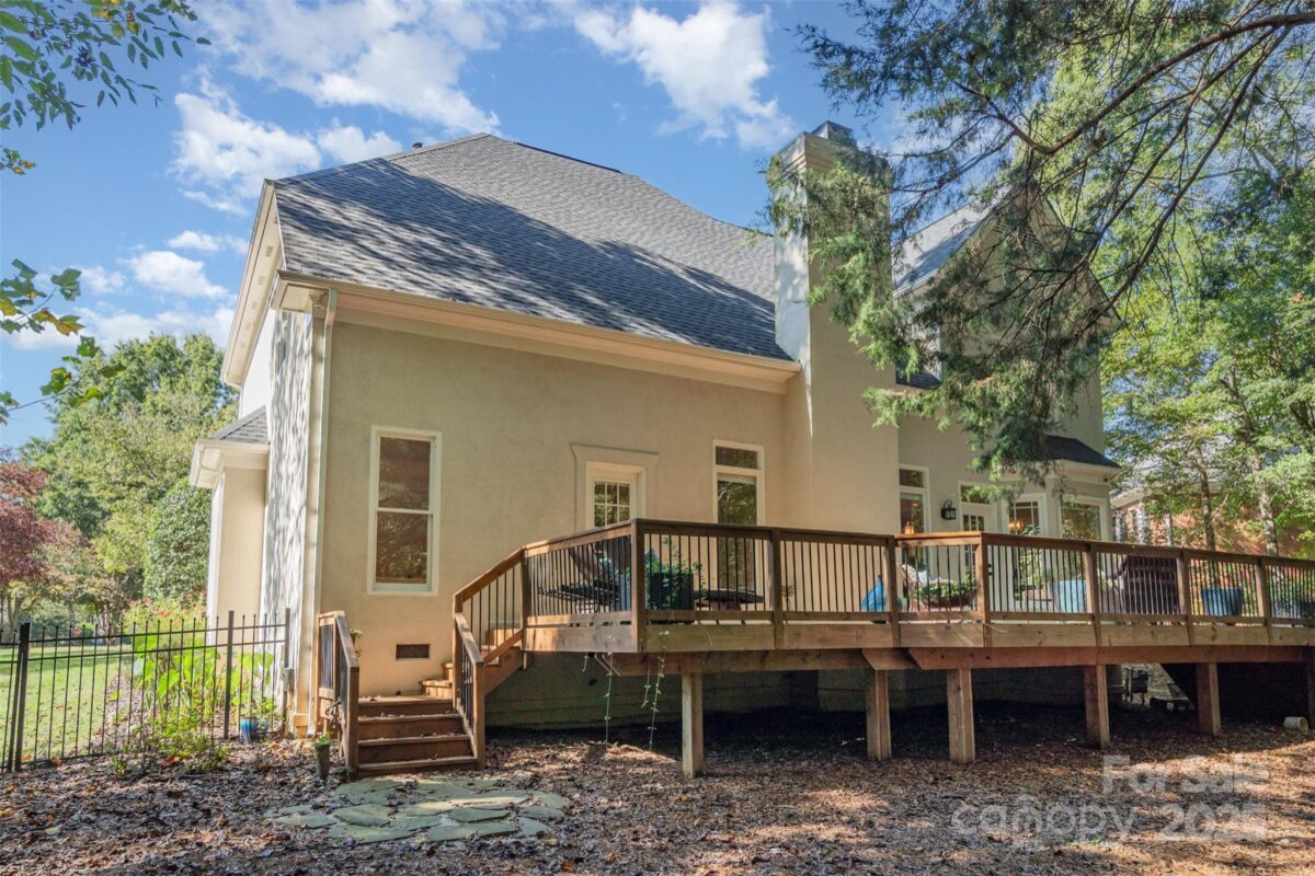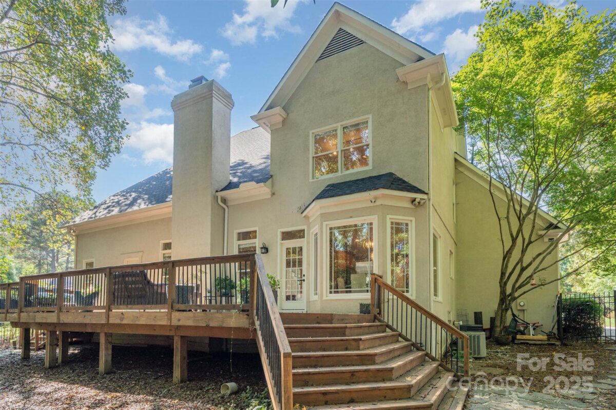 Located in a quiet double cul-de-sac within desirable Providence Crossing, this residence of unique design offers a refined blend of privacy, modern updates and access to the area’s top-rated amenities. The home’s freshly painted interior features refinished hardwood floors, new carpet in the primary suite and upper level, and a layout designed for both daily comfort and effortless entertaining. The two-story great room showcases a gas fireplace and expansive windows, filling the space with natural light. A dedicated office includes a full wall of custom built-ins, ideal for working from home or study needs. The updated kitchen is outfitted with Bosch stainless steel appliances, built-in oven and microwave, and a bright breakfast area with floor-to-ceiling windows overlooking a wooded backyard. The main-level primary suite features a spa-inspired bath with a soaking tub, walk-in shower, and a walk-in closet. A private door opens from the suite directly to the oversized deck, perfect for quiet mornings or evening gatherings. Outdoors, enjoy a massive deck with a private, treed backdrop and the tranquil sound of a nearby fountain. A portion of the expansive backyard is fenced—ideal for little ones and furry companions. Additional features include an entry alarm system, two-car garage with extra storage or workshop space, and fully renovated secondary baths with upgraded lighting and countertops. This move-in ready residence offers proximity to Providence Country Club, Waverly and Ballantyne shopping, dining, fitness centers and more—ideal for buyers seeking lifestyle, location and low-maintenance luxury.