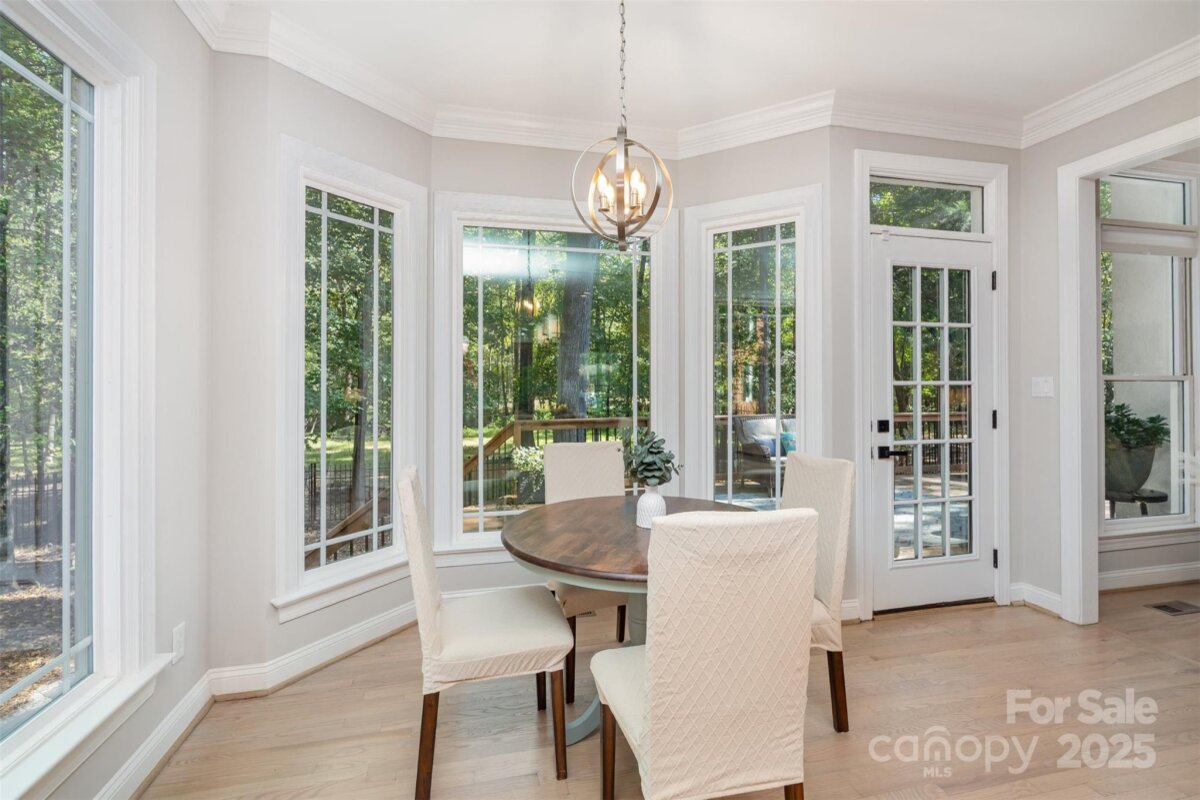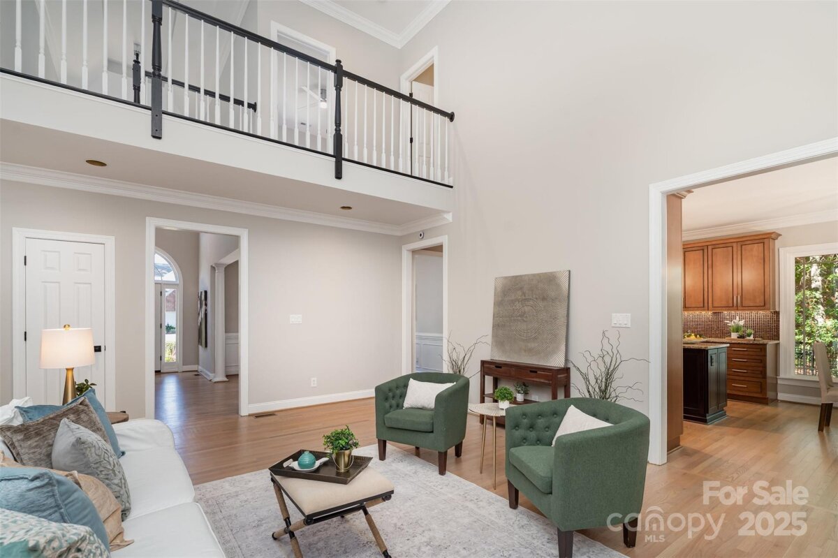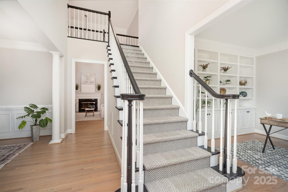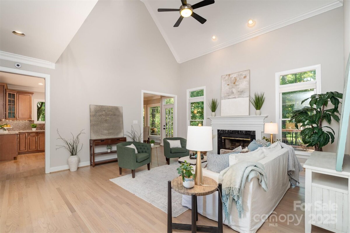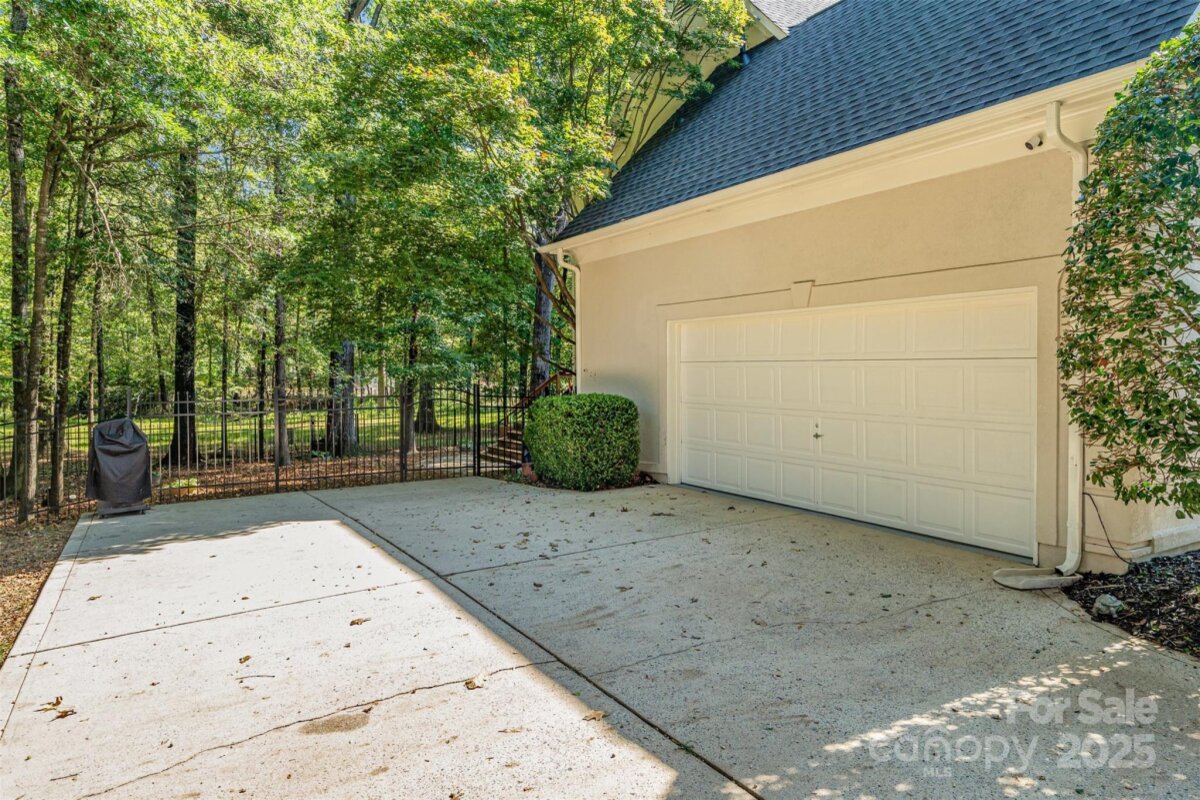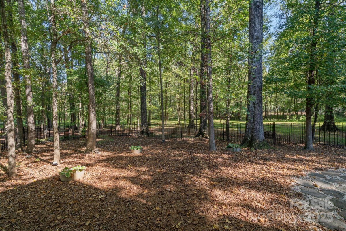 Located in a quiet double cul-de-sac within desirable Providence Crossing, this residence of unique design offers a refined blend of privacy, modern updates and access to the area’s top-rated amenities. The home’s freshly painted interior features refinished hardwood floors, new carpet in the primary suite and upper level, and a layout designed for both daily comfort and effortless entertaining. The two-story great room showcases a gas fireplace and expansive windows, filling the space with natural light. A dedicated office includes a full wall of custom built-ins, ideal for working from home or study needs. The updated kitchen is outfitted with Bosch stainless steel appliances, built-in oven and microwave, and a bright breakfast area with floor-to-ceiling windows overlooking a wooded backyard. The main-level primary suite features a spa-inspired bath with a soaking tub, walk-in shower, and a walk-in closet. A private door opens from the suite directly to the oversized deck, perfect for quiet mornings or evening gatherings. Outdoors, enjoy a massive deck with a private, treed backdrop and the tranquil sound of a nearby fountain. A portion of the expansive backyard is fenced—ideal for little ones and furry companions. Additional features include an entry alarm system, two-car garage with extra storage or workshop space, and fully renovated secondary baths with upgraded lighting and countertops. This move-in ready residence offers proximity to Providence Country Club, Waverly and Ballantyne shopping, dining, fitness centers and more—ideal for buyers seeking lifestyle, location and low-maintenance luxury.