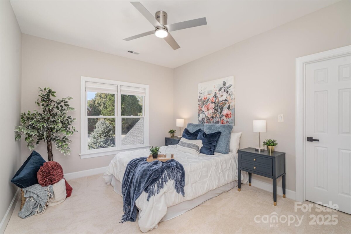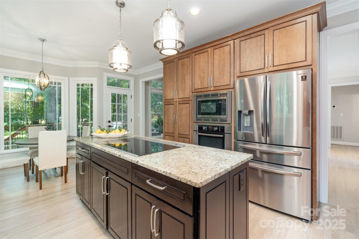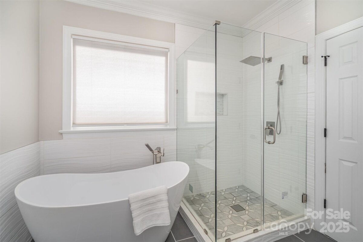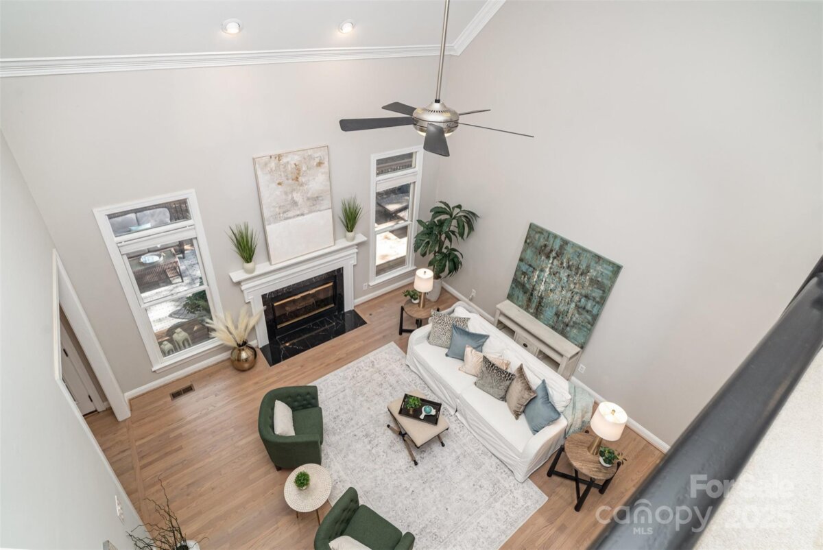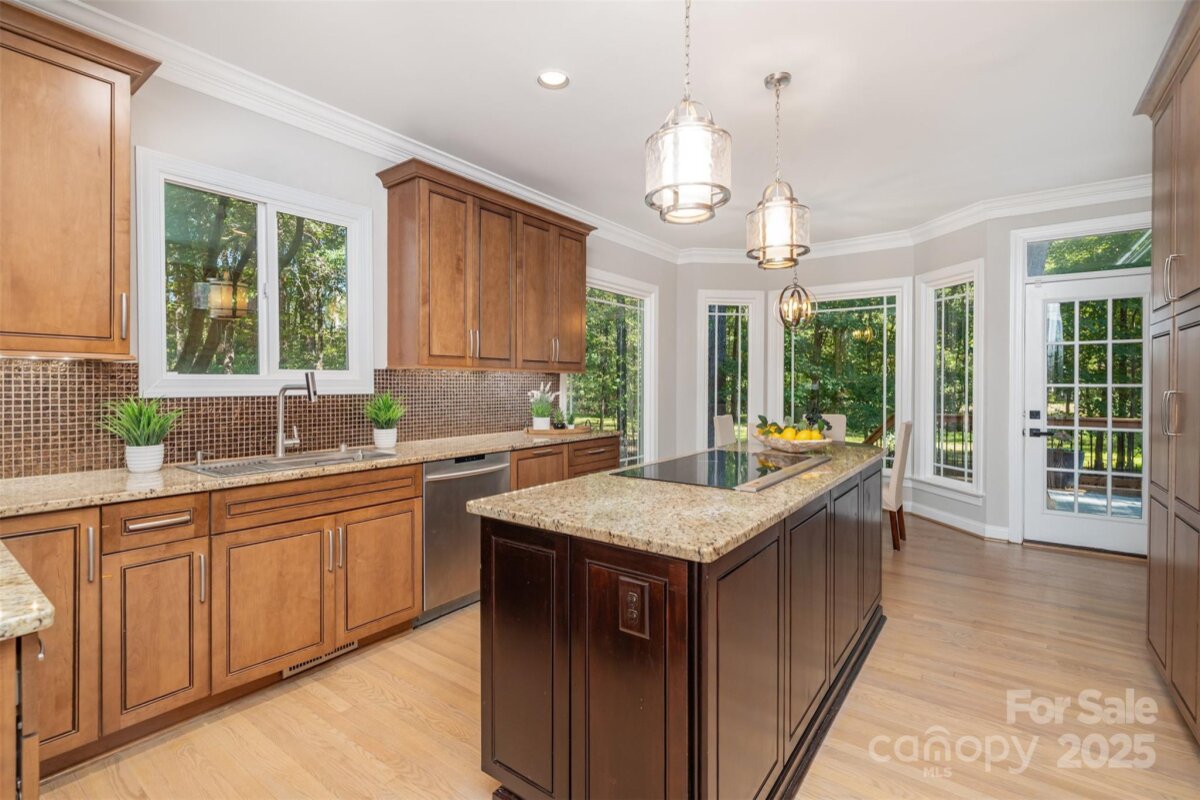 Located in a quiet double cul-de-sac within desirable Providence Crossing, this residence of unique design offers a refined blend of privacy, modern updates and access to the area’s top-rated amenities. The home’s freshly painted interior features refinished hardwood floors, new carpet in the primary suite and upper level, and a layout designed for both daily comfort and effortless entertaining. The two-story great room showcases a gas fireplace and expansive windows, filling the space with natural light. A dedicated office includes a full wall of custom built-ins, ideal for working from home or study needs. The updated kitchen is outfitted with Bosch stainless steel appliances, built-in oven and microwave, and a bright breakfast area with floor-to-ceiling windows overlooking a wooded backyard. The main-level primary suite features a spa-inspired bath with a soaking tub, walk-in shower, and a walk-in closet. A private door opens from the suite directly to the oversized deck, perfect for quiet mornings or evening gatherings. Outdoors, enjoy a massive deck with a private, treed backdrop and the tranquil sound of a nearby fountain. A portion of the expansive backyard is fenced—ideal for little ones and furry companions. Additional features include an entry alarm system, two-car garage with extra storage or workshop space, and fully renovated secondary baths with upgraded lighting and countertops. This move-in ready residence offers proximity to Providence Country Club, Waverly and Ballantyne shopping, dining, fitness centers and more—ideal for buyers seeking lifestyle, location and low-maintenance luxury.