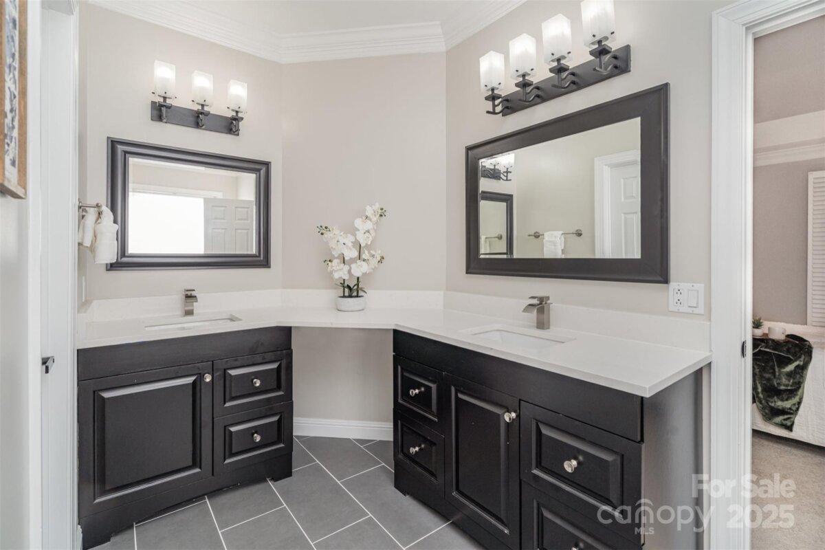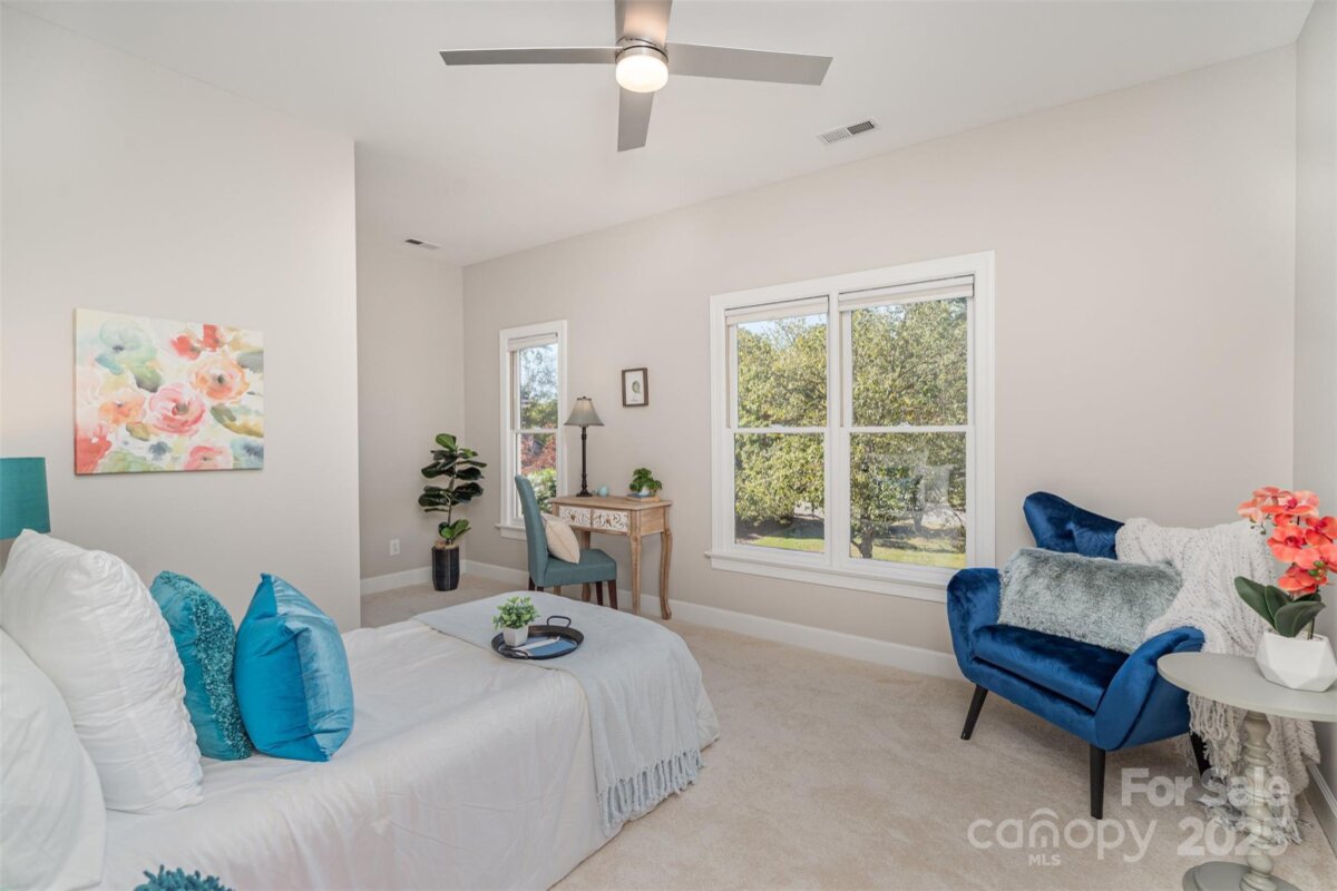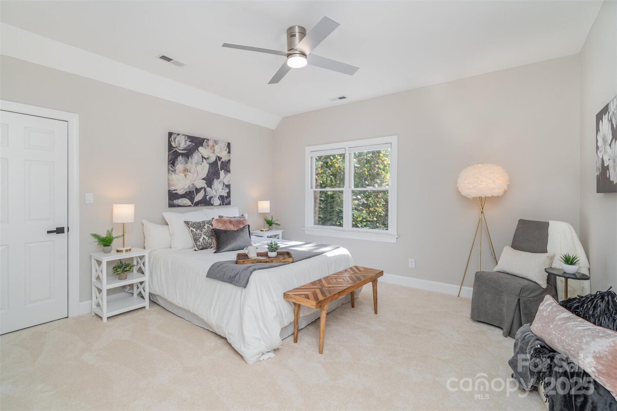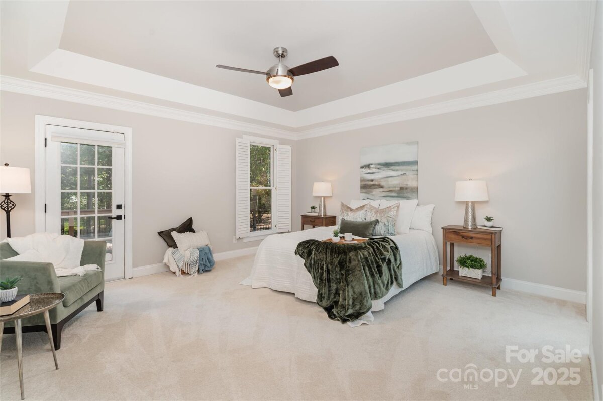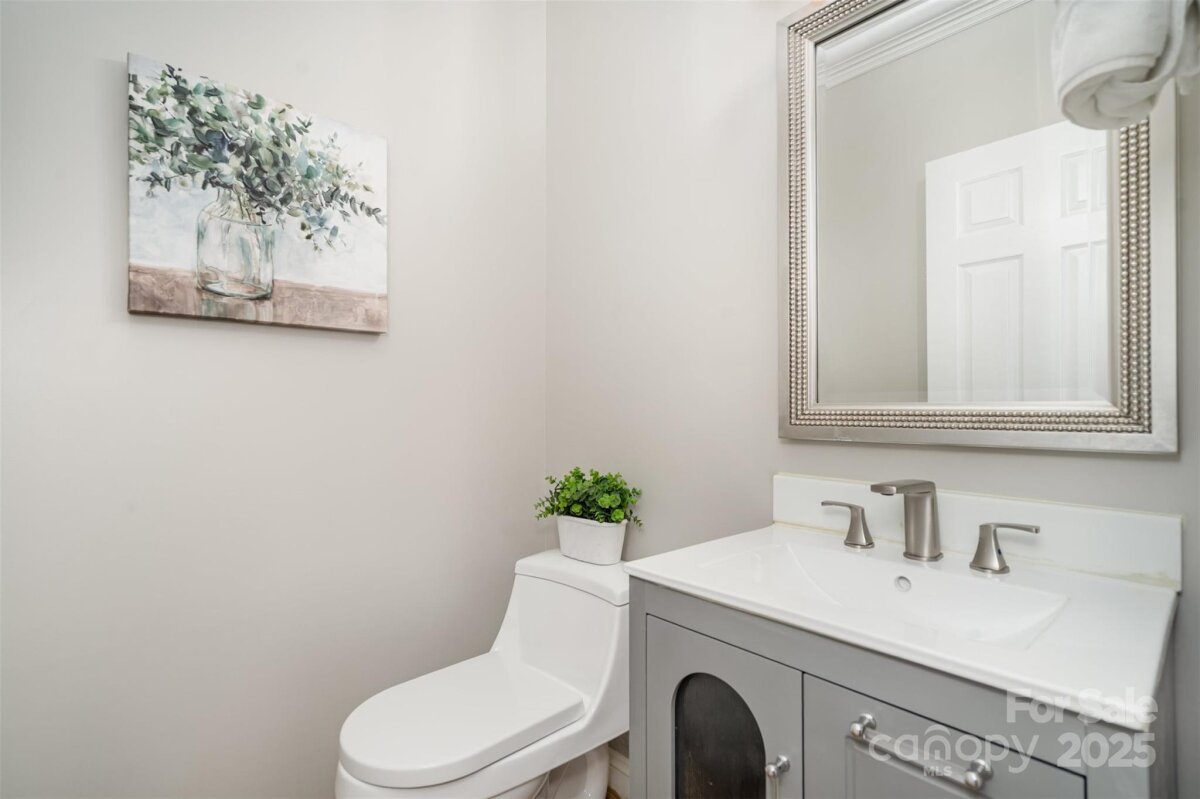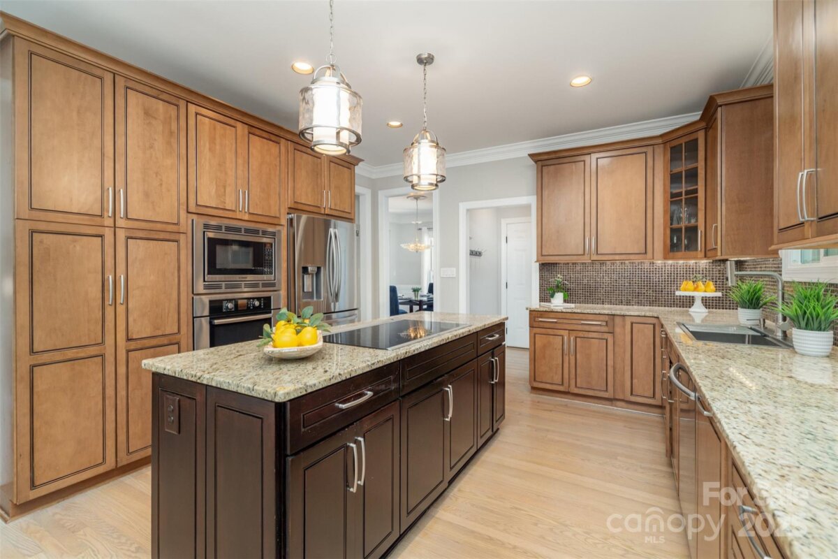Located in a quiet double cul-de-sac within desirable Providence Crossing, this residence of unique design offers a refined blend of privacy, modern updates and access to the area’s top-rated amenities. The home’s freshly painted interior features refinished hardwood floors, new carpet in the primary suite and upper level, and a layout designed for both daily comfort and effortless entertaining. The two-story great room showcases a gas fireplace and expansive windows, filling the space with natural light. A dedicated office includes a full wall of custom built-ins, ideal for working from home or study needs. The updated kitchen is outfitted with Bosch stainless steel appliances, built-in oven and microwave, and a bright breakfast area with floor-to-ceiling windows overlooking a wooded backyard. The main-level primary suite features a spa-inspired bath with a soaking tub, walk-in shower, and a walk-in closet. A private door opens from the suite directly to the oversized deck, perfect for quiet mornings or evening gatherings. Outdoors, enjoy a massive deck with a private, treed backdrop and the tranquil sound of a nearby fountain. A portion of the expansive backyard is fenced—ideal for little ones and furry companions. Additional features include an entry alarm system, two-car garage with extra storage or workshop space, and fully renovated secondary baths with upgraded lighting and countertops. This move-in ready residence offers proximity to Providence Country Club, Waverly and Ballantyne shopping, dining, fitness centers and more—ideal for buyers seeking lifestyle, location and low-maintenance luxury.
