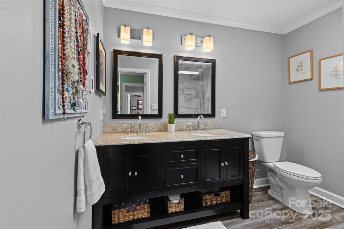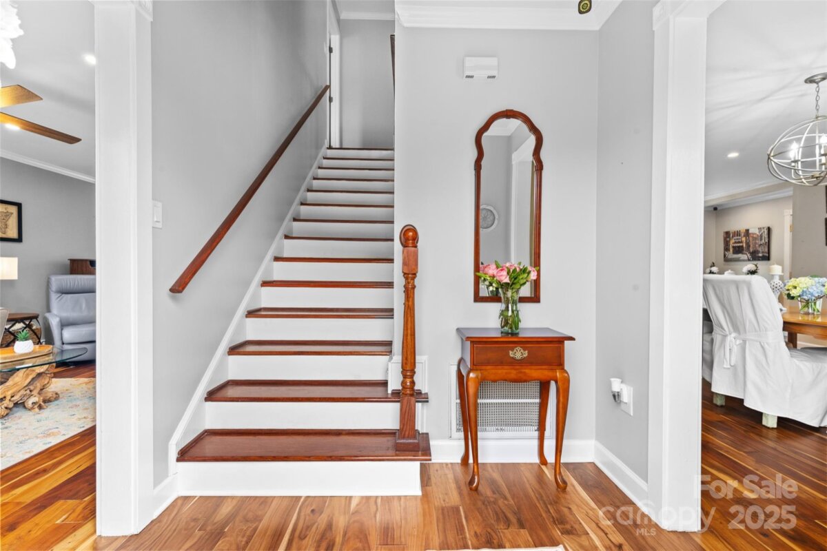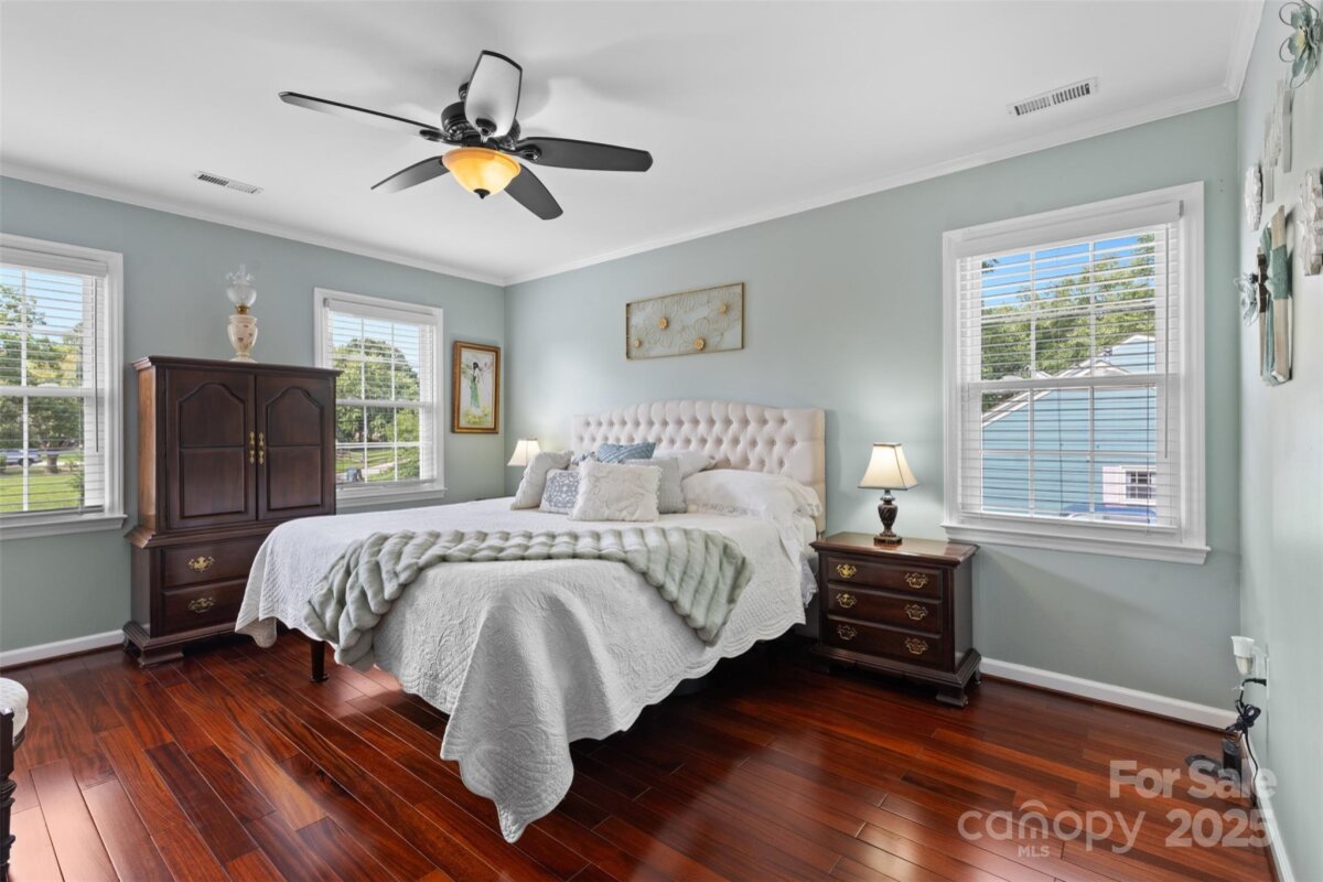 Welcome to Raeburn, one of South Charlotte’s most sought-after neighborhoods renowned for its tree-lined streets and community feel. This beautifully renovated home combines timeless craftsmanship with modern comfort, all while backing up to a permanently protected community green space with walking track, playground, and ball field. Step inside to find over $200,000 in thoughtful upgrades. The owner’s suite is a true retreat with solid oak flooring, custom closets, and a spa-inspired bathroom featuring Italian tile, a glass-enclosed walk-in shower with rain head, massage jets, bench, heated floors, and skylight. A second full bath offers a double vanity and new tile, while additional bedrooms feature crown molding, hardwoods, and custom built-ins. The heart of the home is a chef’s kitchen with ceiling-height cabinetry, soft-close storage, granite counters, a farmhouse sink, Bosch appliances, gas cooktop with convection oven, and a 3x6 island with pendant lighting—perfect for gatherings. The kitchen flows seamlessly into the family room with custom cabinetry, dining room with stone fireplace, and multiple living areas enhanced by crown molding, custom millwork, and upgraded LED lighting throughout. Outdoor living is unmatched: a 16x38’ deck with a 13x13’ gazebo (lighting, ceiling fan, and outlets) overlooks a private, fully fenced yard with mature peach and fig trees, raised garden beds, and solar lighting. The oversized two-car garage, expanded driveway, and concrete pad provide ample parking and storage. Behind the walls, major systems have been modernized for efficiency and peace of mind: upgraded 150-amp electrical, new wiring throughout main level, Westinghouse tankless water heater, new insulation, and a 2018 HVAC system with high-efficiency ductwork. Durable James Hardie siding and a newer roof complete the exterior. Every detail has been considered—from custom closet organizers and hardwood staircases to built-in media wiring and a hardwired security camera system. This is truly a move-in ready home designed for comfort, functionality, and long-term durability. Located minutes from Blakeney, Ballantyne, and Stonecrest, with top-ranked schools and abundant shopping, dining, and recreation at your fingertips, this property delivers the best of South Charlotte living.