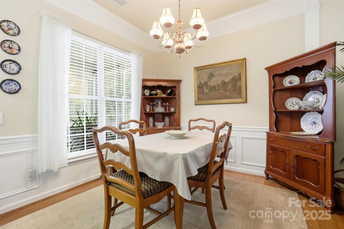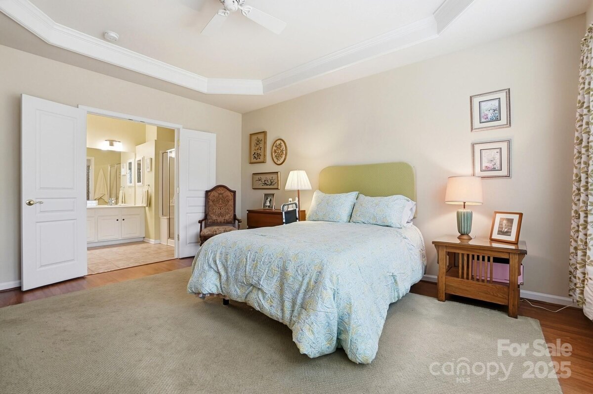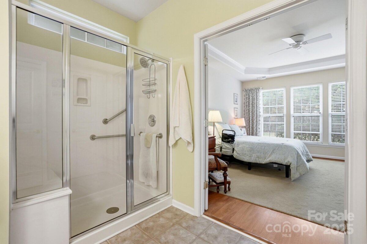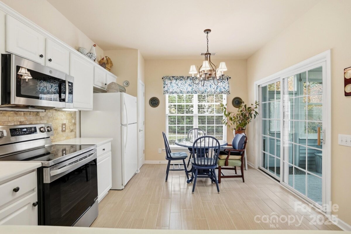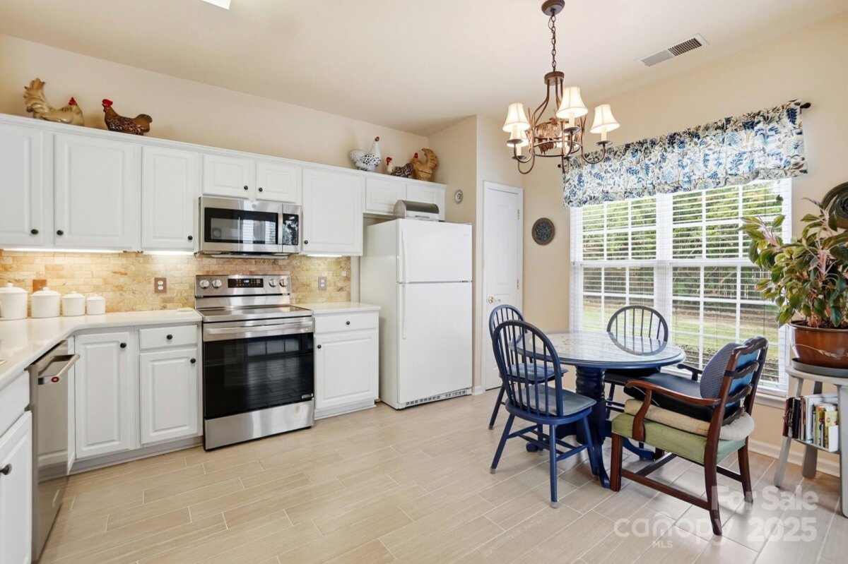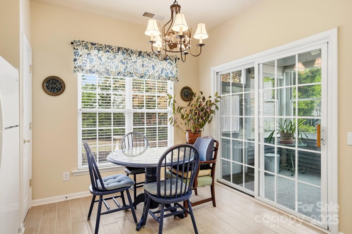 Discover the perfect home designed with comfort and convenience in mind, ideally suited for those seeking a serene and low-maintenance lifestyle. Situated in a peaceful cul-de-sac between the vibrant Blakeney and Stonecrest Shopping areas, this charming one-story residence offers the best of both worlds: tranquility and accessibility. Step inside to find a welcoming living space that creates a cozy and easy-to-maintain environment. The kitchen is equipped with recently updated stainless steel appliances, paired with quartz countertops. A spacious walk-in closet doubles as a pantry, offering ample storage space for all your kitchen essentials. The primary bedroom is designed for relaxation, featuring a tray ceiling and a generous walk-in closet. The adjoining bathroom offers practicality and comfort with its oversized shower, double sinks, and updated light fixtures, making daily routines a breeze. Enjoy peace of mind with a private yard and an enclosed porch, perfect for enjoying quiet mornings or afternoons in the fresh air. With lawn care included, you can relish the beauty of your surroundings without the upkeep. Additional features include a long driveway and an extra parking pad, providing ample space for guests when they visit. A double garage with a large storage room ensures plenty of space for your belongings. Recent updates include a new roof and A/C system, both installed in 2025, providing modern amenities and reliability. This home is part of a welcoming community that offers a fantastic clubhouse, outdoor pool, and tennis courts, providing opportunities for socializing and leisure activities just steps from your door. This home is an ideal retreat, offering a blend of simplicity and convenience that's perfect for those looking to downsize or enjoy a relaxed, single-level living experience. Come see how this lovely home can fit your lifestyle today!