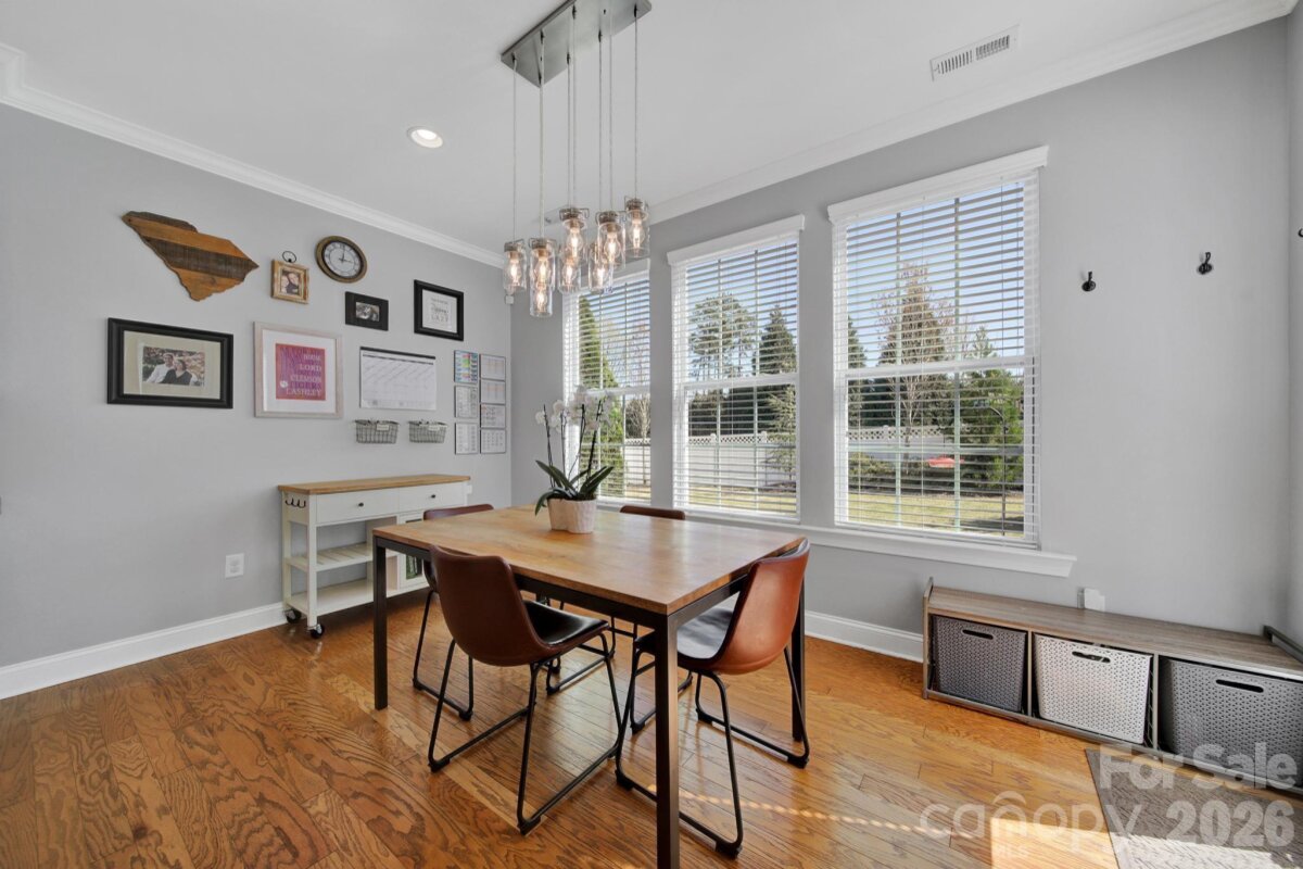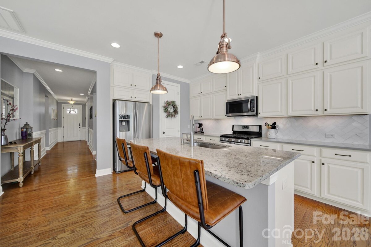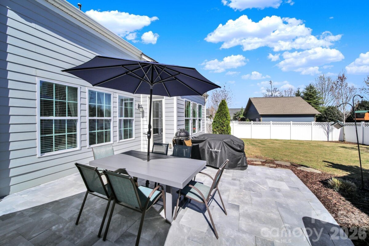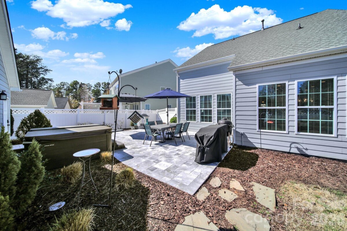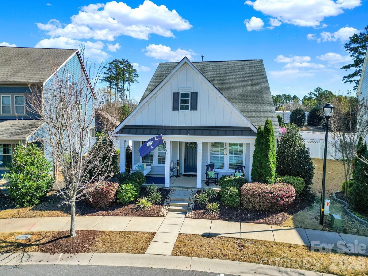 This stunning open-concept home is drenched in natural light and boasts a professionally landscaped yard with irrigation, extensive paver patio, and fully fenced yard, complete with an oversized Charleston-style covered front porch—perfect for relaxing evenings or morning coffee. The kitchen is a chef’s dream, featuring an oversized island with ample seating, stacked cabinets, gas range, stainless steel appliances, and an open dining area that flows seamlessly to the patio for effortless indoor-outdoor living and entertaining. The main level is highlighted with beautiful pre-engineer hardwood floors, a private office with French doors, and a spacious living room ideal for family gatherings. The primary suite on the main floor offers a spa-like bathroom, with a walk-in closet, creating a private retreat. Laundry room is conveniently located on the main level with extra storage closet. Upstairs, you’ll find a versatile loft, two additional bedrooms, a full bath, and a large walk-in storage closet completing the second level. Enjoy a vibrant community lifestyle with amenities including a clubhouse, pool, two playgrounds, walking trails, two scenic ponds, and nearby walkable dining options. All of this is located within the award-winning Fort Mill School District. This home combines modern comfort, thoughtful design, and an ideal location. Welcome home!