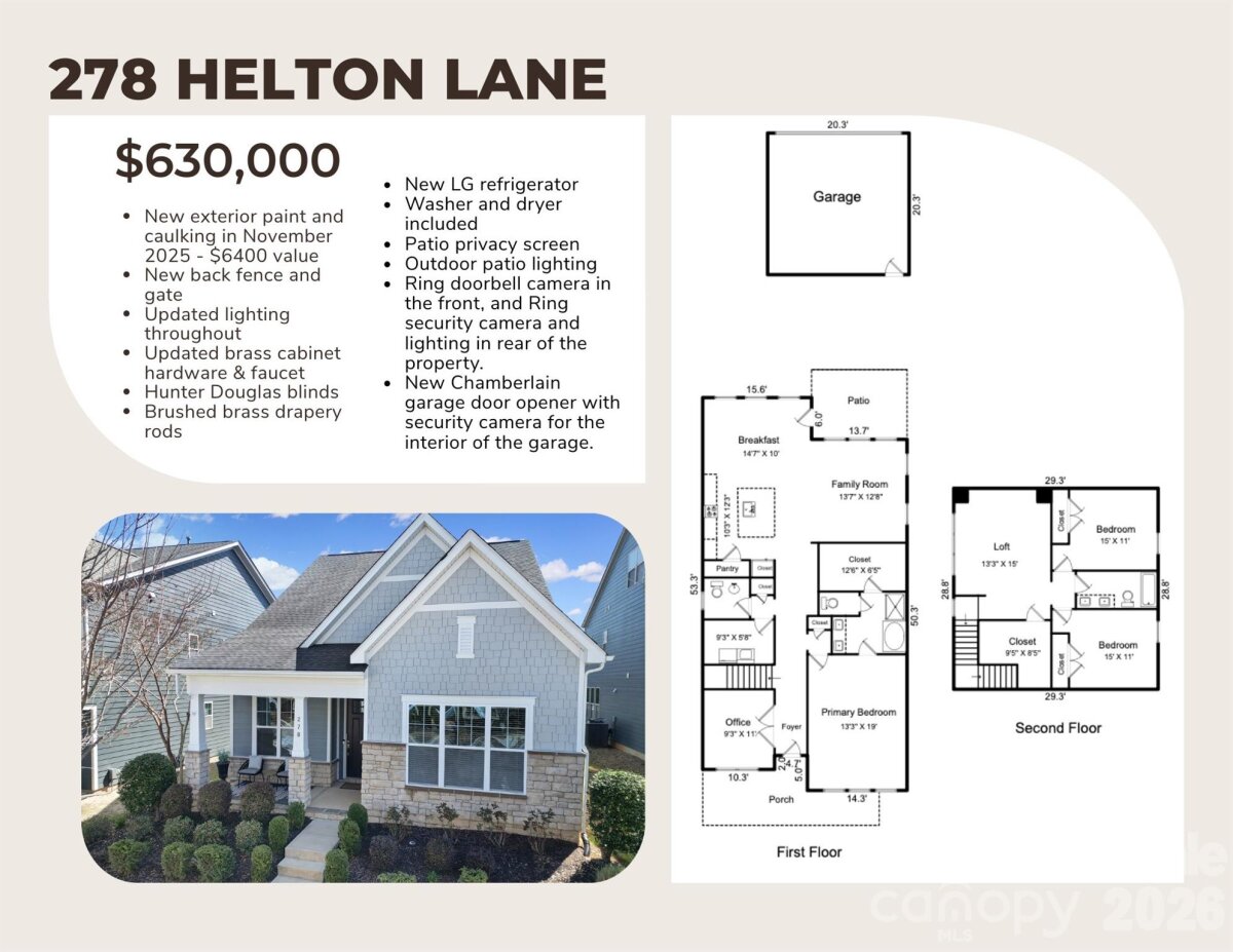 This is the one you’ve been waiting for! Blending modern luxury with thoughtful functionality, this pristine home offers an open-concept layout designed for both everyday living and effortless entertaining. The stunning kitchen features sleek countertops, a large center island, and seamless flow into the light-filled dining and living areas—creating the perfect gathering space for family and friends. The spacious primary suite on the main level provides a private retreat, complete with a spa-inspired bath featuring a separate garden tub, glass-enclosed shower, and a generous walk-in closet. A dedicated main-level home office offers a bright and quiet space ideal for remote work, while a convenient half bath and spacious laundry room add to the home’s thoughtful design. Upstairs, you’ll find two additional bedrooms, a full bathroom, and a large loft, offering flexible space for guests, hobbies, or a media/playroom. Step outside and enjoy the charm of this beautiful setting. Relax on the inviting front porch overlooking the picturesque tree-lined street and stunning sunsets, or unwind in the low-maintenance backyard oasis, complete with a paver patio and built-in fire pit—perfect for entertaining year-round. Located in the highly desirable Brayden community in the top-rated Fort Mill School District, residents enjoy a walkable lifestyle just steps from restaurants, shopping, entertainment, and the sparkling community pool. With a freshly painted exterior and move-in ready condition, this home is ready for its next owners to enjoy.