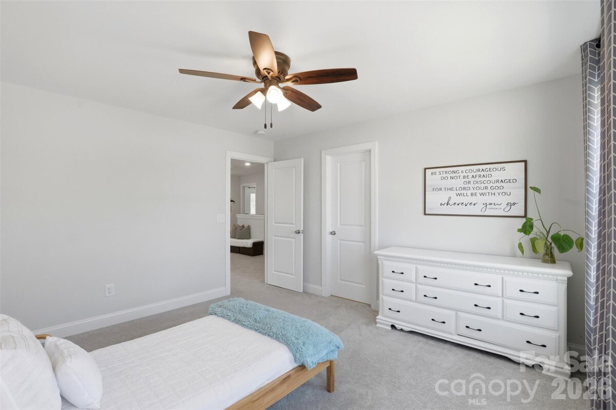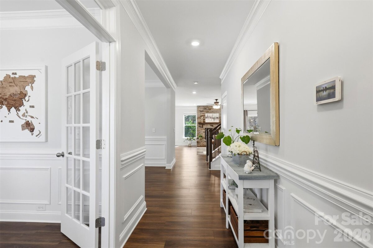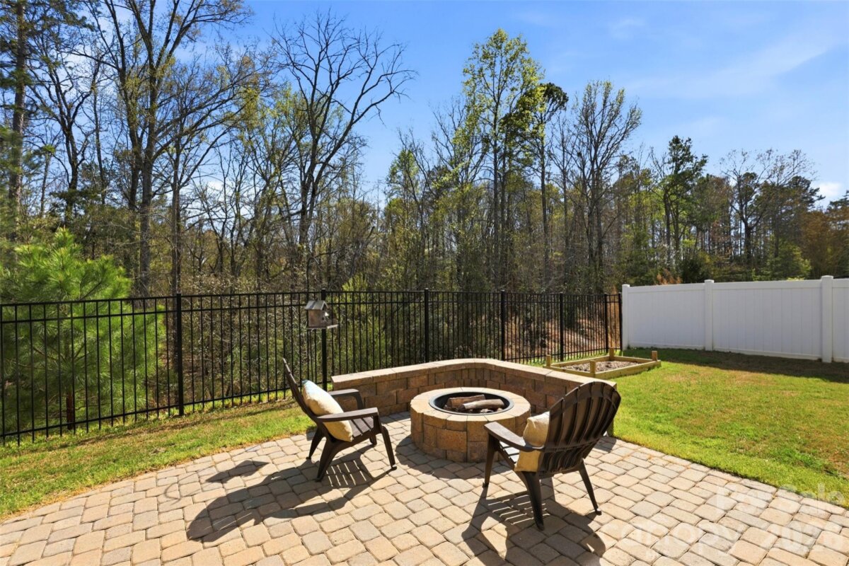 Beautifully maintained 5-bedroom, 3-bath home with 3,137 square feet of well-designed living space. This two-story home offering timeless curb appeal, thoughtful design, and inviting indoor-outdoor living. The charming exterior features attractive stone accents, multiple front-facing gables, a covered rocking-chair front porch, and a spacious finished two-car garage equipped with EV outlet and lawn equipment storage cove. Inside, the home opens to a bright, elegant foyer accented by crown molding, wainscoting, and rich LVP flooring that flows throughout the main living areas. A private front office with French doors provides the perfect work-from-home space, while the formal dining room offers an ideal setting for gatherings and holidays. The heart of the home is the open-concept kitchen and living area. The kitchen is beautifully appointed with custom white cabinetry, stainless steel appliances, a gas cooktop, wall oven and microwave, tile backsplash, pendant lighting, and a large center island with extra cabinets on the seating side. It opens seamlessly to the breakfast area and spacious great room, where a striking floor-to-ceiling stone fireplace creates a warm focal point. Main level guest room with ensuite. Flex space/mud room/drop zone conveniently off the garage. Upstairs, 3 generous secondary bedrooms and a versatile loft provide flexible living space for guests, recreation, or media use. The oversized primary suite offers a relaxing retreat with abundant natural light, a large walk-in closet, and a spa-like bath featuring a soaking tub and separate tiled shower. Laundry room w/sink conveniently located upstairs. Step outside to enjoy a fenced backyard complete with a covered patio, extended paver patio, natural gas to grill and fire pit area. Backing to a wooded setting, the outdoor space offers a private backdrop for entertaining and relaxing. Situated on a .13-acre lot in Walnut Creek, where residents enjoy sports fields, tennis courts, swimming pools, clubhouse with exercise room, pond, and walking trails.