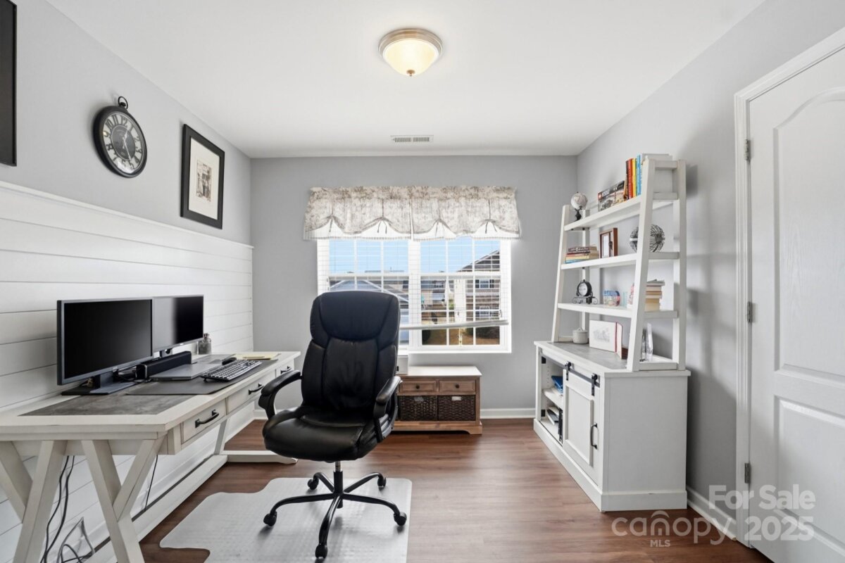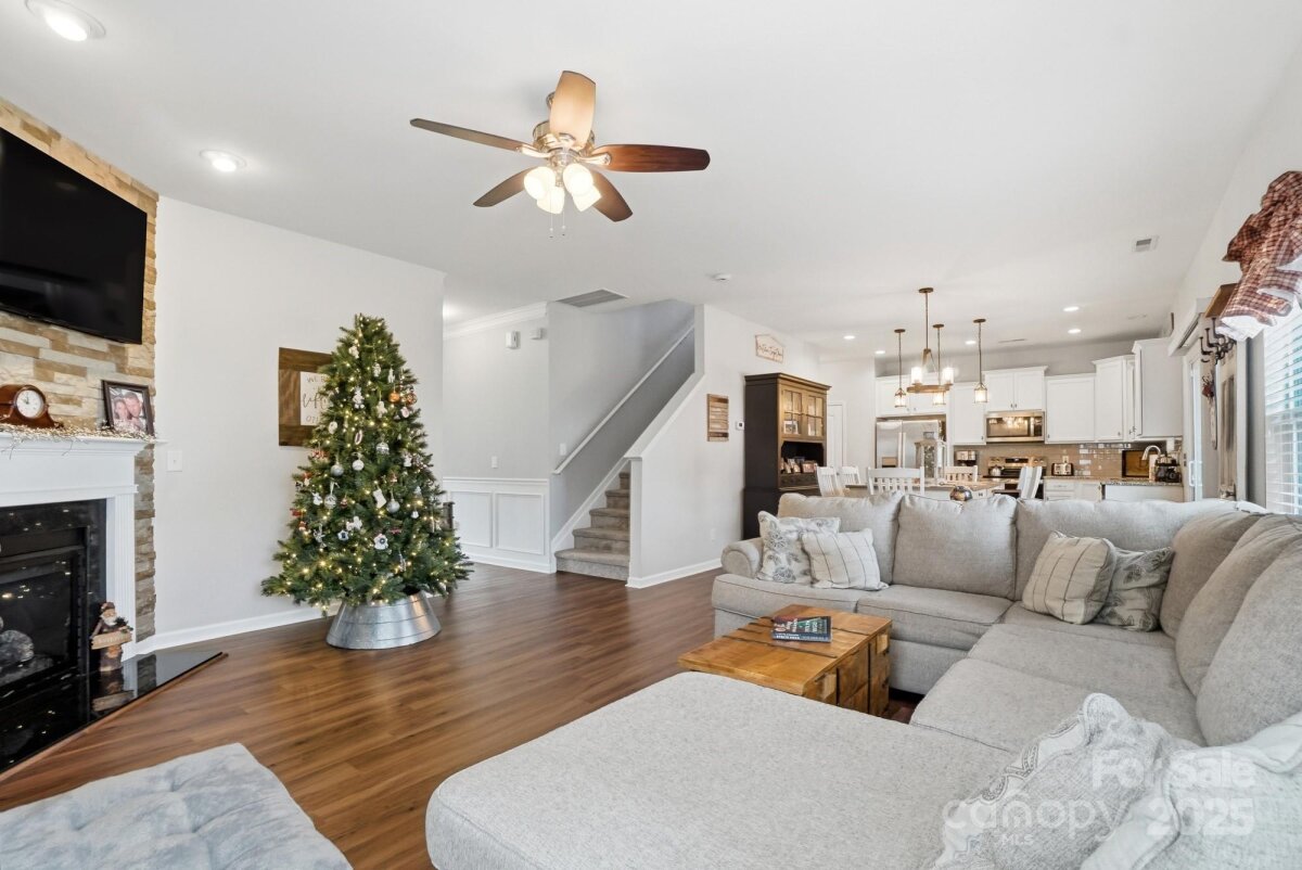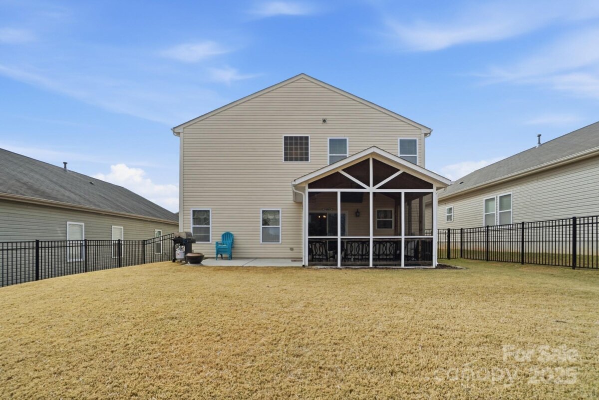 Welcoming and beautifully finished, this home greets you with a rocking chair covered front porch and a floor plan filled with thoughtful custom touches throughout. Step into the bright living room with crown molding that sets the tone for the rest of the home, then continue to the main level half bath accented with crown and wainscoting for a polished look and a new beautiful standalone vanity. A large family room featuring a gas fireplace with a brick surround and flows into the kitchen, where you will find a brick front island, freshly painted white cabinets, a new stainless-steel dishwasher installed in 2024, and a new stainless-steel stove installed in 2025. Durable LVP flooring added in 2024 that flows throughout the bottom floor and all bathrooms, providing style and easy maintenance. Upstairs, the spacious primary suite offers an updated bath with quartz countertops and painted gray vanities, standalone shower, and garden soaking tub. Three secondary bedrooms provide flexibility, including one with wainscoting and chair rail molding for added character. The additional office/bedroom and loft feature shiplap accents, creating inviting spaces for work, hobbies, or guests. Second full bath also includes new quartz countertops and freshly painted gray vanity. Outside, enjoy a beautiful furnished screened porch that opens to a patio and fenced backyard, ideal for relaxing, entertaining, or pets. This home combines character, quality finishes, and modern updates so you can move in and enjoy right away. This home is like new and an absolute MUST SEE! Close to great schools, shopping and restaurants. DO NOT MISS THIS HOME!!