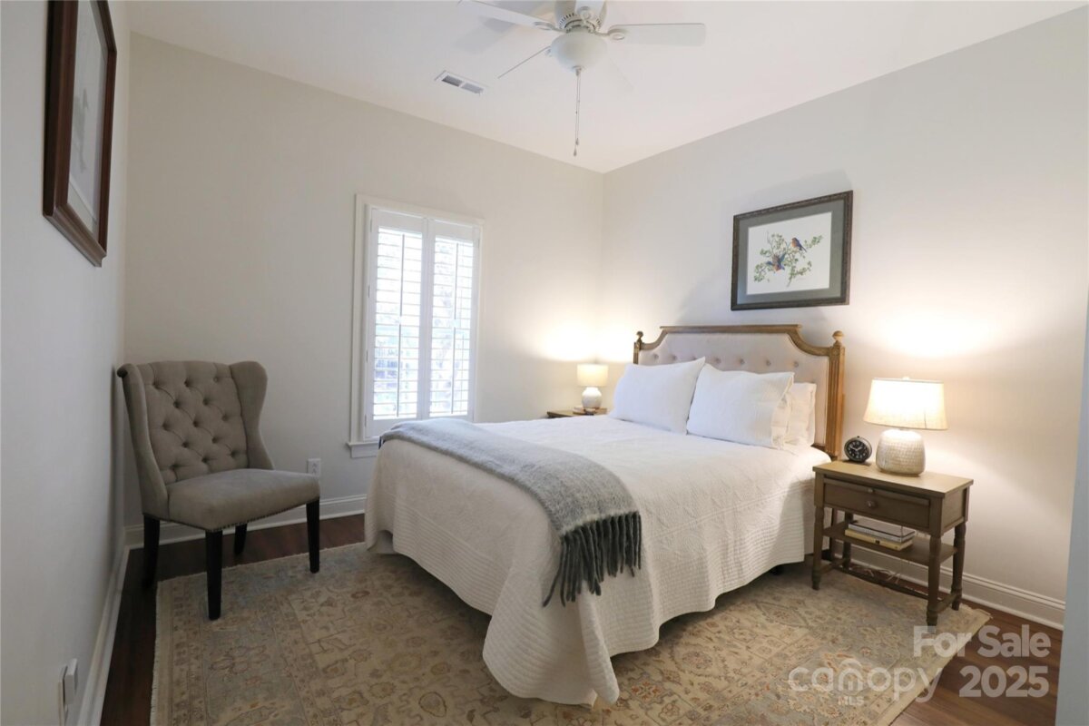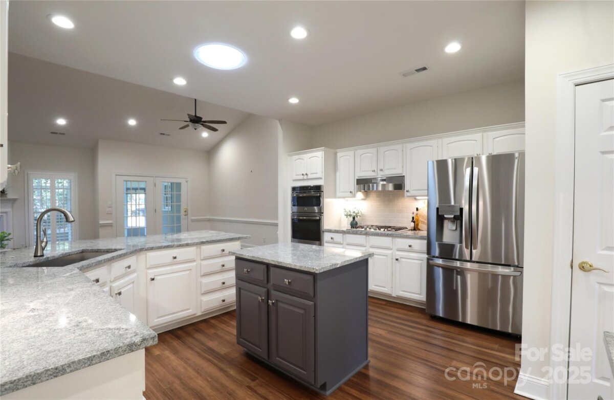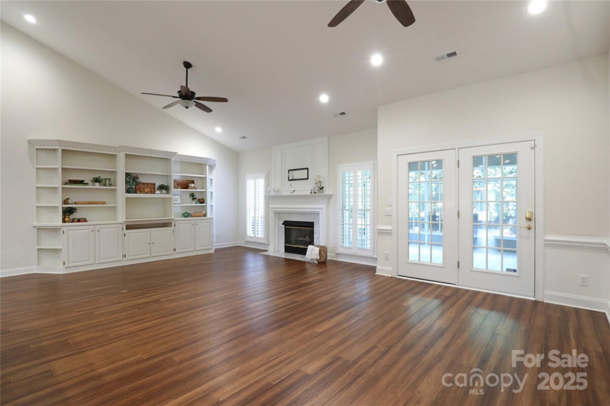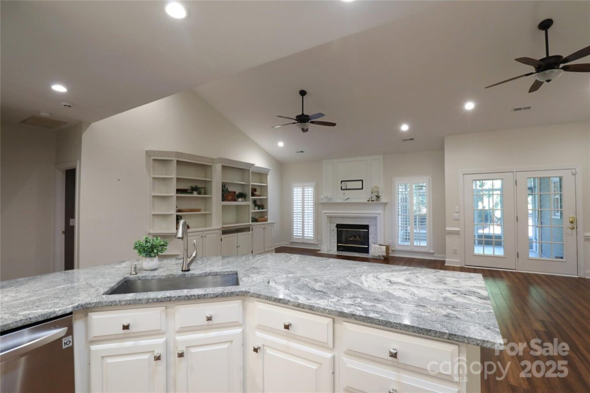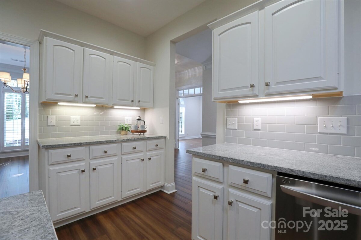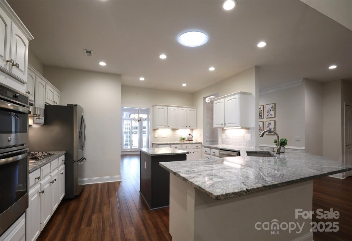 Very hard to find 4 bedroom / 2 bath ranch home with office features top-level finishes and upgrades in desirable Hunter Oaks! Beautifully updated flooring in all living and bedroom areas welcome as you enter the spacious foyer. French doors lead to office with updated recessed lighting. Gorgeous open kitchen with ample counter space and cabinetry plus gorgeous upgraded granite and deep single-basin sink with bar seating. Solar tube added in kitchen to bring in additional natural light with night-light option. Spacious living room centers the home with built-ins, gas log fireplace, and beautifilly connects this split-bedroom plan. Primary suite with trey ceiling and upgraded bath with walk-in shower, dual shower heads, towel warmer, and more! All windows upgraded with plantation shutters and sunroom windows upgraded with custom roller shades. 21 x 21' garage with epoxy floor (2021). Replaced existing deck with Trex and extended with new stairs (2023). New aluminum fence (2022). Tankless water heater (2021). Whole house water filtration (2021). Updated with beautiful landscaping and uplighting added to compliment irrigation system already in place. HVAC system updated (2022). Encapsulated crawl space (2022). Gutters upgraded to new 6" gutters and gutter guards (2022). Electrical panel upgraded (2025). All windows screens replaced (2022). Google Fiber available. Just minutes from Blakeney and Waverly shopping and restaurants. Beautiful neighborhood amenities and walking trails.