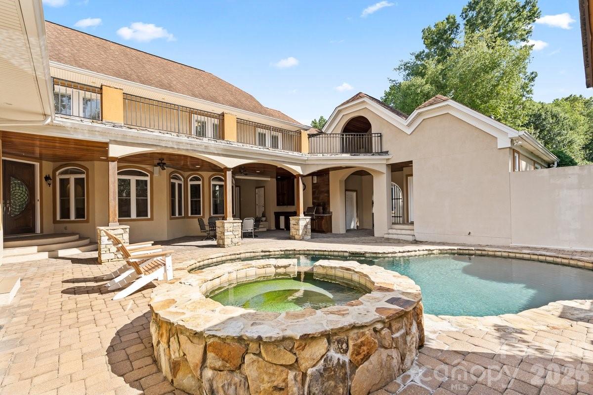This custom Spanish-style courtyard home features a primary suite on the main level and offers exceptional indoor and outdoor living, complete with serene views of a natural spring-fed pond. The private courtyard oasis with a saltwater pool, hot tub, sauna, and a fully equipped outdoor kitchen—perfect for relaxation and entertaining. The spacious and inviting layout provides excellent flow throughout the home. Additionally, a separate second living quarter adds flexibility and comfort. It has a great entertainment room with a projector and the whole house surround sound system. The total heated living area measures 4,123 square feet, which includes the second living quarter. The range features downdraft vents that lift and vent out. This property is truly unique, blending luxury, privacy, and beauty! The seller will provide a credit of $750 towards a one-year home warranty. The community has a clubhouse with a fitness center, pool, playground, tennis courts, and a walking trail