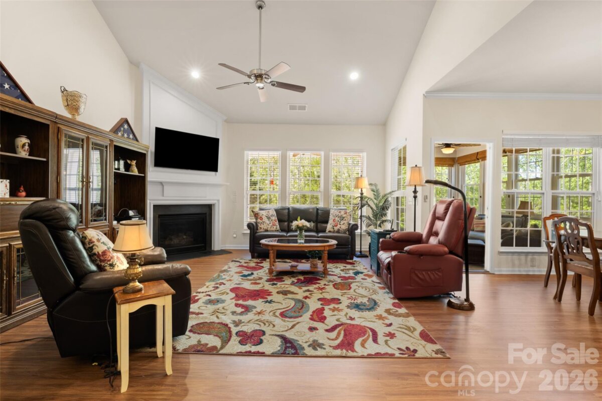 Welcome to this beautifully maintained 1.5-story Copper Ridge model in the highly sought-after Sun City Carolina Lakes - where comfort, style, and an active lifestyle come together. Step inside to a bright and inviting living room featuring a soaring vaulted ceiling and a cozy gas log fireplace, creating the perfect gathering space. A wall of windows fills the home with natural light and offers peaceful views of the backyard, while the open layout flows effortlessly into the dining area - ideal for both everyday living and entertaining. The kitchen is thoughtfully designed with a breakfast bar that connects the space, along with granite countertops, a tile backsplash, and a gas range - perfect for preparing meals with ease. Just off the main living area, double doors lead to a private home office or study, offering a quiet retreat for work or hobbies. The primary suite, tucked at the rear of the home for added privacy, features a tray ceiling and a well-appointed ensuite bath complete with a double sink vanity, soaking tub, and a glass-enclosed walk-in shower. A spacious secondary bedroom at the front of the home provides convenient access to a full hall bath. Upstairs, a versatile loft offers the perfect second living area, media room, or flex space. An additional bedroom with access to a full bath makes an ideal guest suite or multi-purpose room. Enjoy the best of Carolina living outdoors in the 3-season room or relax on the partially covered patio with a paver extension - perfect for soaking up the sun while overlooking mature shade trees and a serene backyard setting. Residents of Sun City Carolina Lakes enjoy an exceptional array of resort-style amenities, including golf, indoor and outdoor pools, tennis, pickleball, and a vibrant selection of social clubs and activities. This home offers the perfect blend of comfort, flexibility, and community living - don’t miss your opportunity to make it yours.